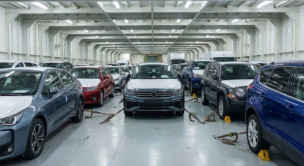 our vehicle's safety during the voyage is paramount. Inside the massive RORO vessels, cars are driven to designated decks, parked securely, and lashed down to prevent movement, completely protected from saltwater and weather elements.